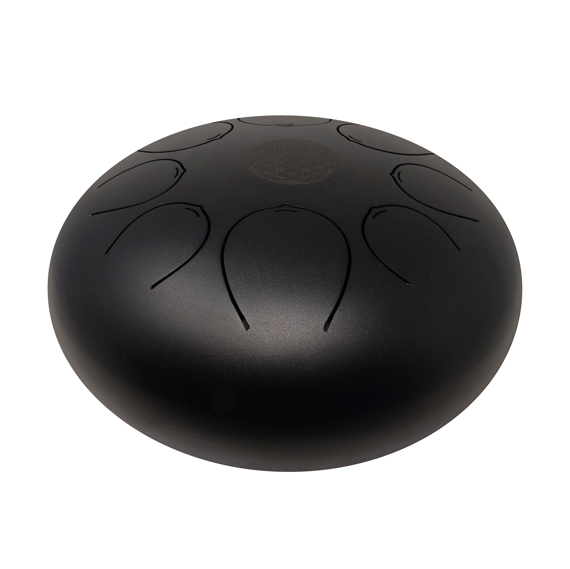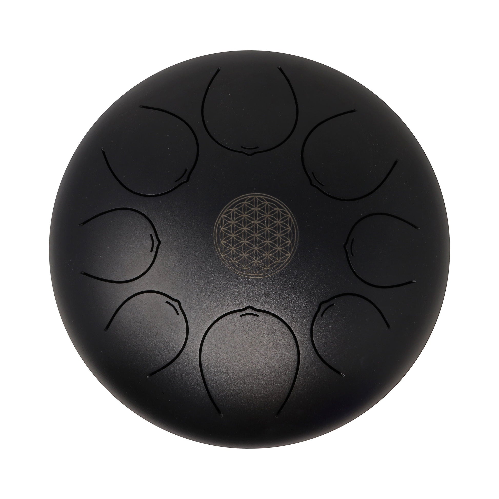 This is our largest tongue drum, known for its deep rich tones. With a sleek black shade and the symbol of the flower of life in the center, it is a stylish addition to any meditation space or living room. The drum comes with a travel bag/backpack for easy transportation. Tongue drums have a long history, originating from the Aztecs and African slit drums. The best part is, anyone can play this intuitive instrument without any prior musical skill. Just pick up the mallets and start playing the tongue-shaped cutouts. Enjoy the benefits of playing without any limitations.